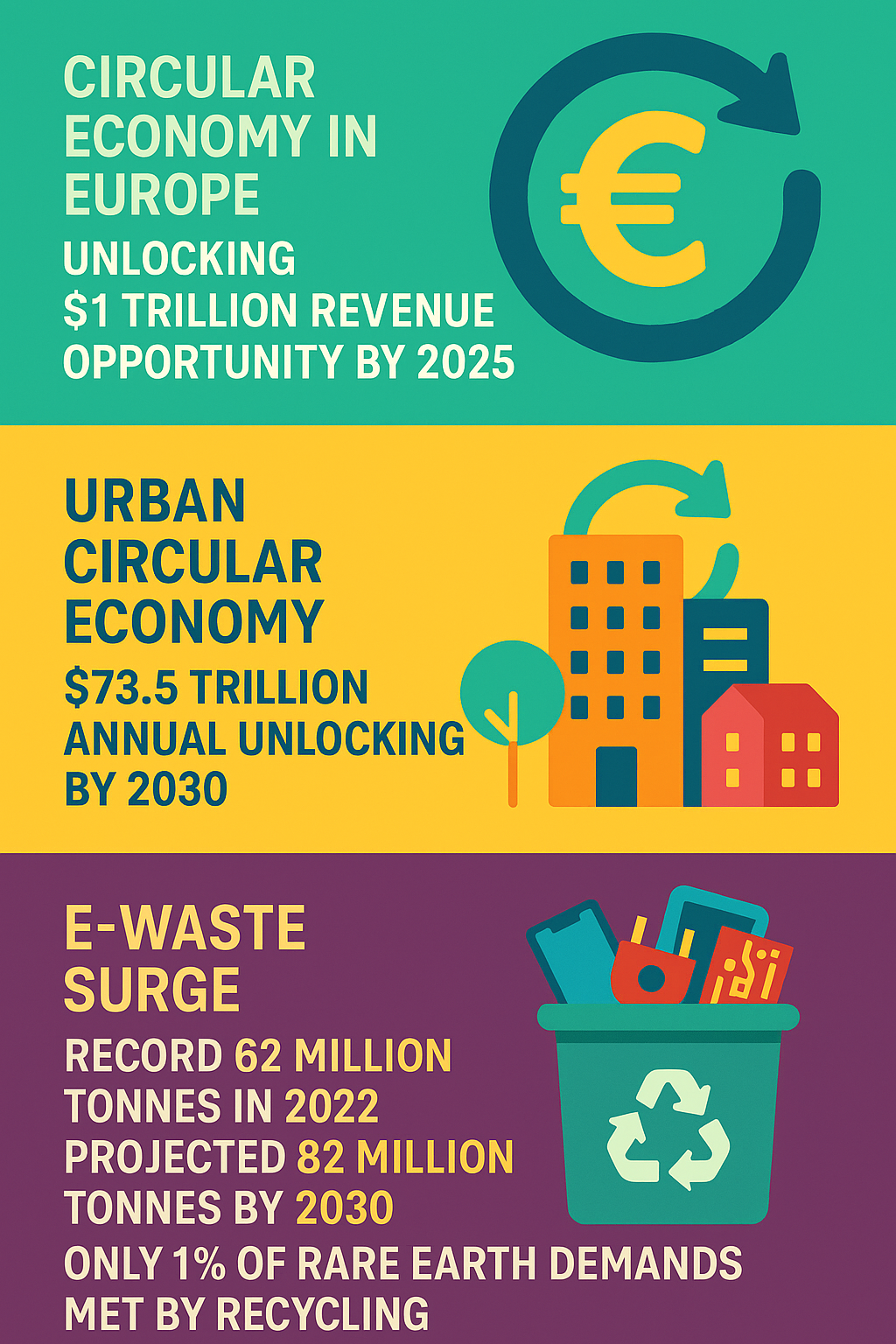 In parallel, electronic waste (e-waste) is increasing globally, with projections from 62 million tonnes in 2022 rising to approximately 82 million tonnes by 2030 (Scrap Monster). Urban systems, as major e-waste generators and repositories, will increasingly bear the burden and opportunity of recovering critical raw materials embedded in discarded electronics. This dynamic will require multi-stakeholder collaboration and deeper integration of circular economy principles into urban planning and governance.