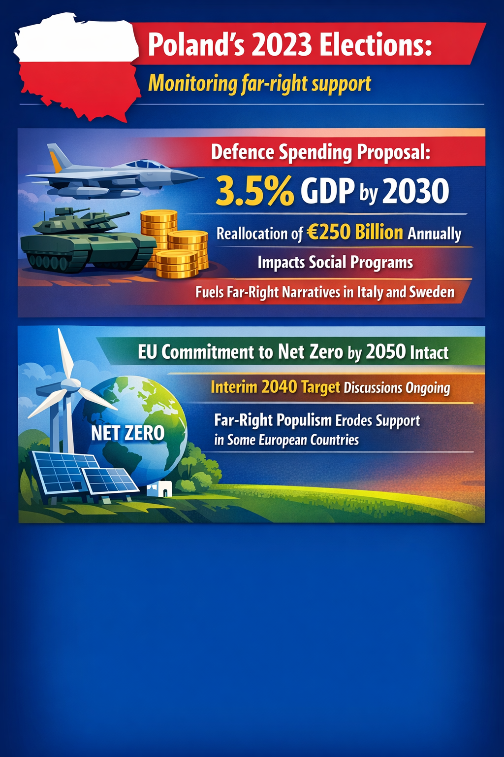 Another major development lies in the defence spending landscape. Proposed increases in European defence budgets to 3.5% of GDP by 2030 require reallocating approximately €250 billion annually from social programs, which risks fueling far-right narratives centered on sacrifice, nationalism, and distrust of established governments. Italy and Sweden have already seen these tensions rise, illustrating how fiscal policy and security objectives can be leveraged in political messaging frameworks (FAF).